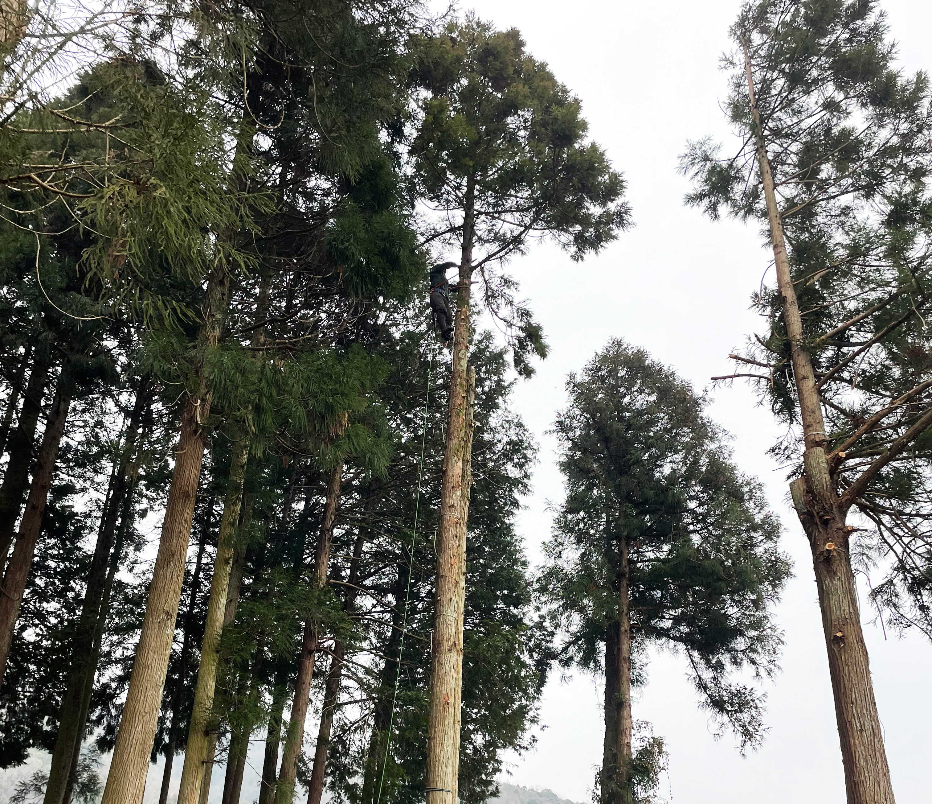 私たち高坂林業は、特殊伐採に特化した林業会社です。住宅密集地や電線のそば、急斜面や重機の入らない狭い場所など、通常の伐採では対応が難しい現場でも、安全かつ確実な作業を行っています。